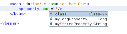 </bean> The properties we'd like to set are children of the bean node. Netbeans comes with nice autocompletion support for the property names as you can see from the screenshot.