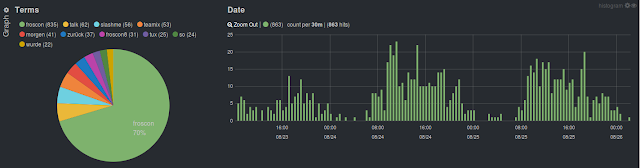 Kibana 3 is a pure HTML/JS frontend for Elasticsearch that you can use to build dashboards for your data. We are still working with the example data the is indexed using the Twitter River. It consists of tweets for FrOSCon but can be anything, especially data that contains some kind of timestamp as it's the case for tweets. To install Kibana you can just fetch it from the GitHub repostory (Note: now there are also prepackaged archives available that you can download without cloning the repository):