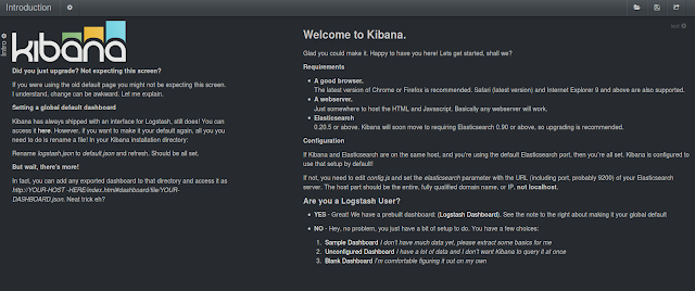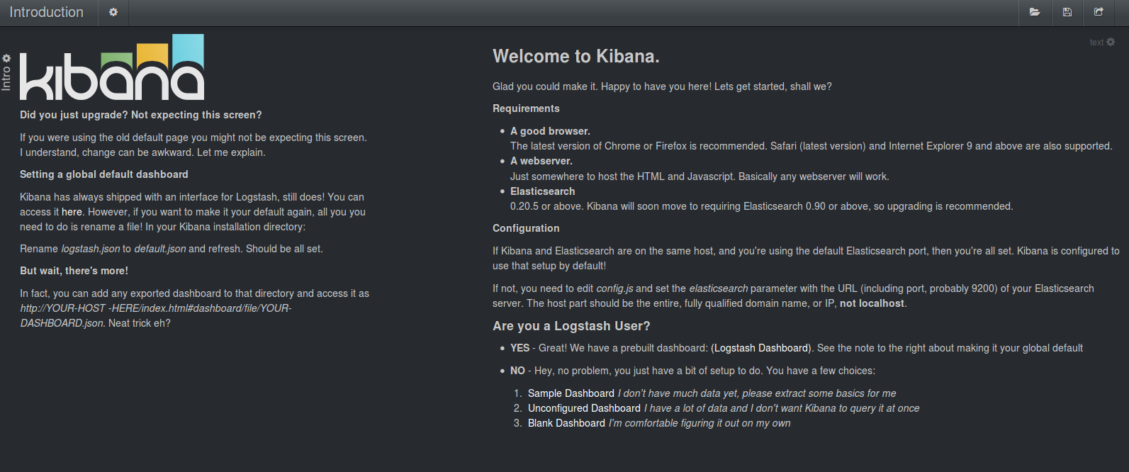 When accessing Kibana you are directed to a welcome page from where you can choose between several dashboard templates. As Kibana is often used for logfile analytics there is an existing dashboard that is preconfigured to work with Logstash data. Another generic dashboard can be used to query some data from the index but we'll use the option "Unconfigured Dashboard" which gives some hints on which panels you might want to have.