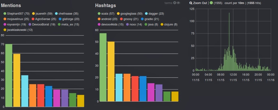 16 Nov 2013For the first time in several years I unfortunately had to skip this years Devoxx. There are so many tweets that remind me of the good talks going on there and I thought I would do something useful with them. So again I indexed them in Elasticsearch using the Twitter river and therefore can look at them using Kibana. David Pilato also has set up a public instance and I could imagine that there will be a more thorough analysis done by the Devoxx team but here are my thoughts on this years Devoxx without having been there.