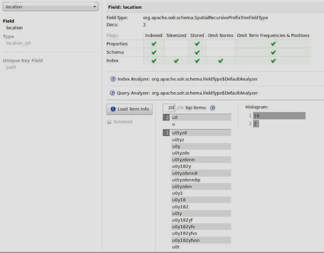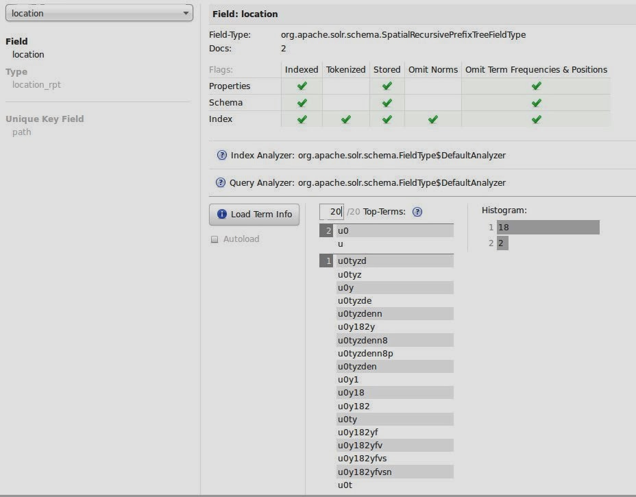 Again, the location of the first document is Mannheim, the second Karlsruhe. You can see that the locations are encoded in an ngram-like fashion when looking at the schema browser in the administration backend: