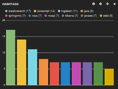 This is a surprise: elasticsearch beats any other hashtag. logstash, kibana, springmvc, roca ... very specialized hashtags as well. As you can see from the numbers there weren't that many tweets at all.