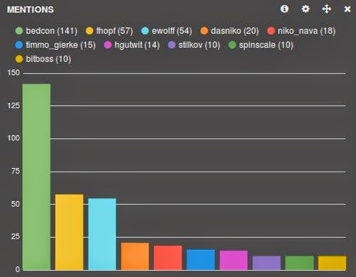 I know, I am repeating myself, but again I stored all the tweets for the conference in Elasticsearch so I can look at them using Kibana. The usual rules apply, each retweet counts as a seperate tweet. I am using a sharded version of the index so some of the counts might not be totally exact.
