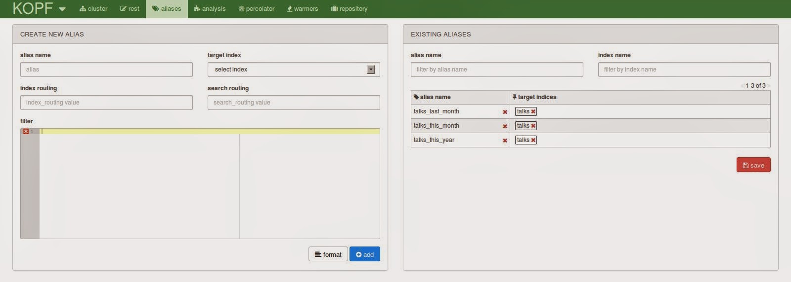 Using the aliases tab you can have a convenient form for managing your index aliases and all the relevant additional information. You can add filter queries for your alias or influence the index or search routing. On the right side you can see the existing aliases and remove them if not needed.