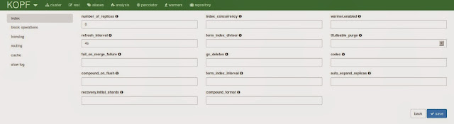 Creating a new index brings up a form for entering the index data. You can also load the settings from an existing index or just paste the settings json in the field on the right side.