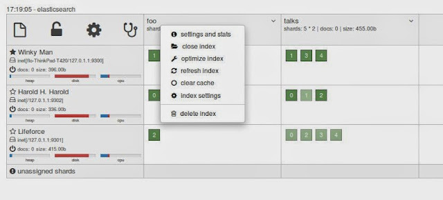 Using the little dropdown just next to the index name you can execute some operations on the index. You can view the settings, open and close the index, optimize and refresh the index, clear the caches, adjust the settings or delete the index.